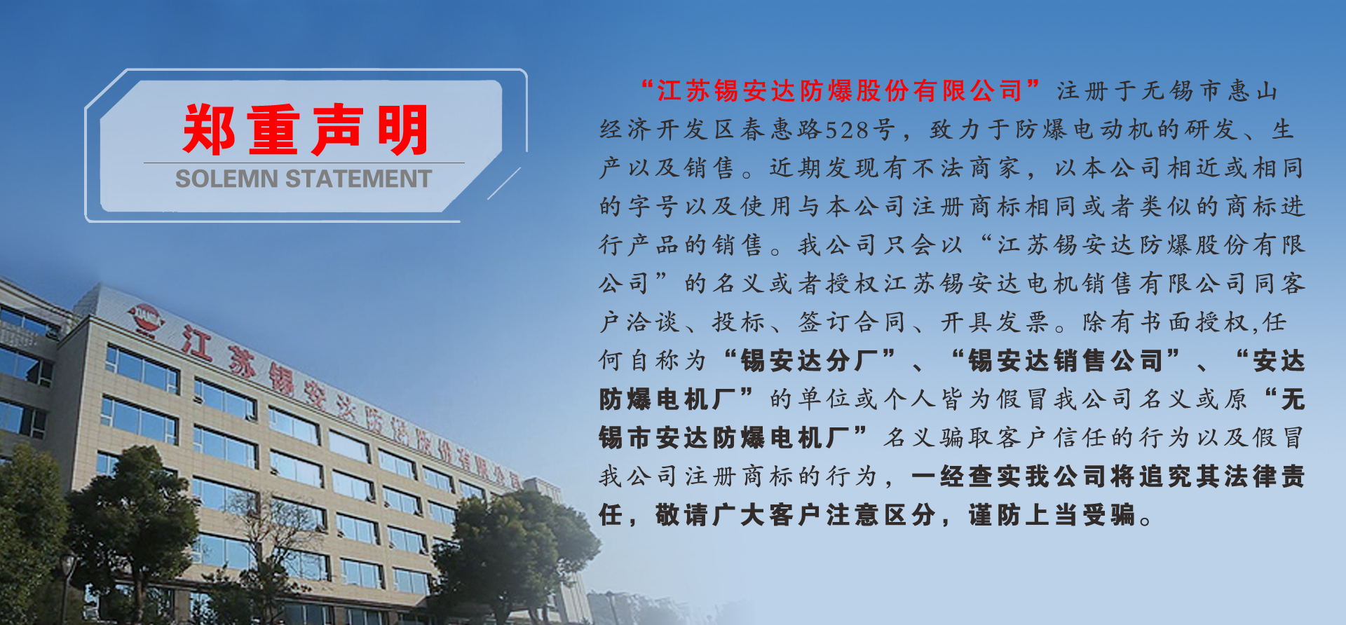 江蘇錫安達(dá)防爆股份有限公司由無錫市安達(dá)防爆電機(jī)廠和江蘇安達(dá)防爆機(jī)電集團(tuán)有限公司組建而成,從1986年起開始生產(chǎn)防爆電機(jī),是首批獲得全國(guó)工業(yè)產(chǎn)品生產(chǎn)許可證的防爆電機(jī)企業(yè)。
